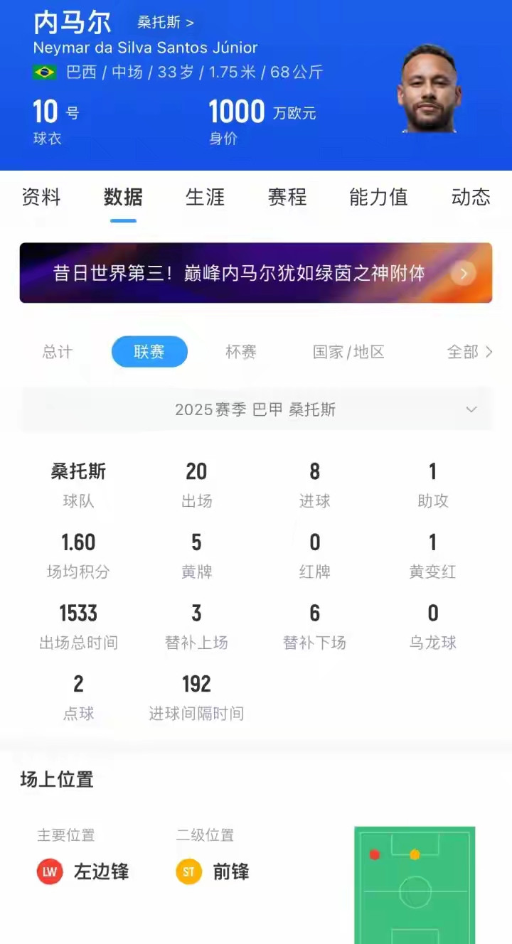 内马尔曾被视为梅西与C罗之后的“足坛第三人”,职业生涯早期身价一度高达1.8亿欧元。然而近年来由于伤病等因素影响,其状态与身价持续下滑,本赛季在巴甲出场28次,贡献11球4助攻,未能阻止身价继续走低。